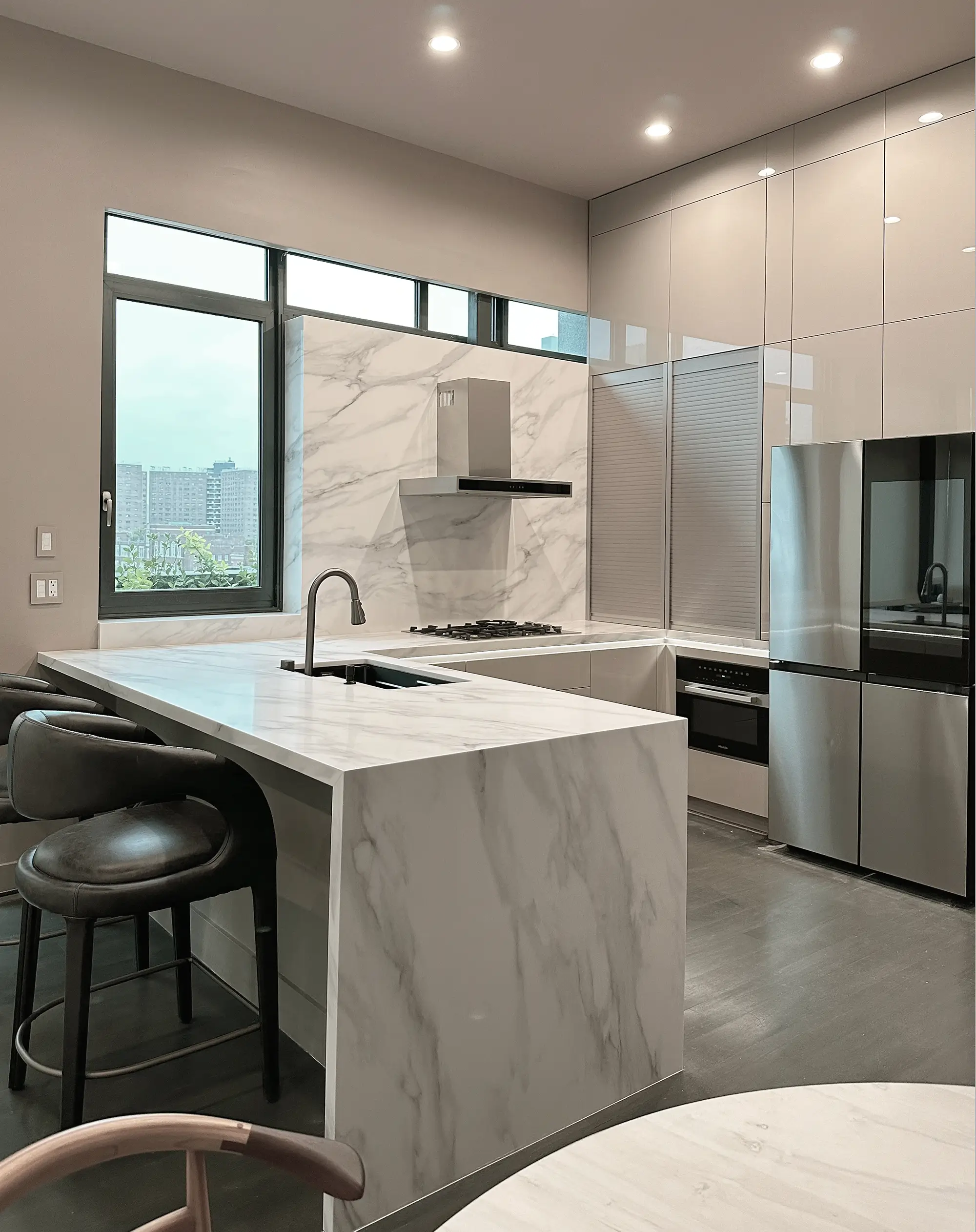Set in the heart of Manhattan, this compact kitchen combines the sleek gloss of Rio SandGrau fronts with a striking marble-look countertop and backsplash. The result is a refined, modern space that feels bright, open, and effortlessly elegant — all carefully tailored within a $24K cabinetry budget.