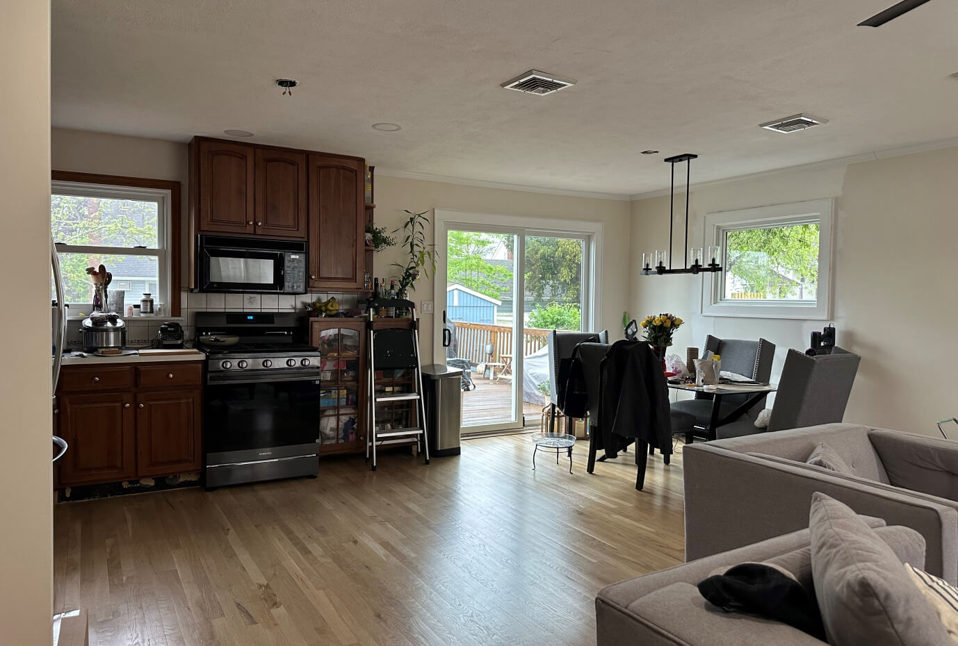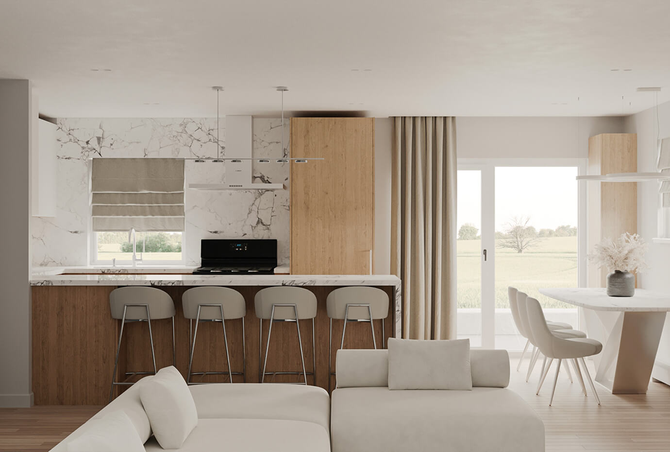 Seamless integration of kitchen into living space; maximize storage while maintaining minimalist aesthetics