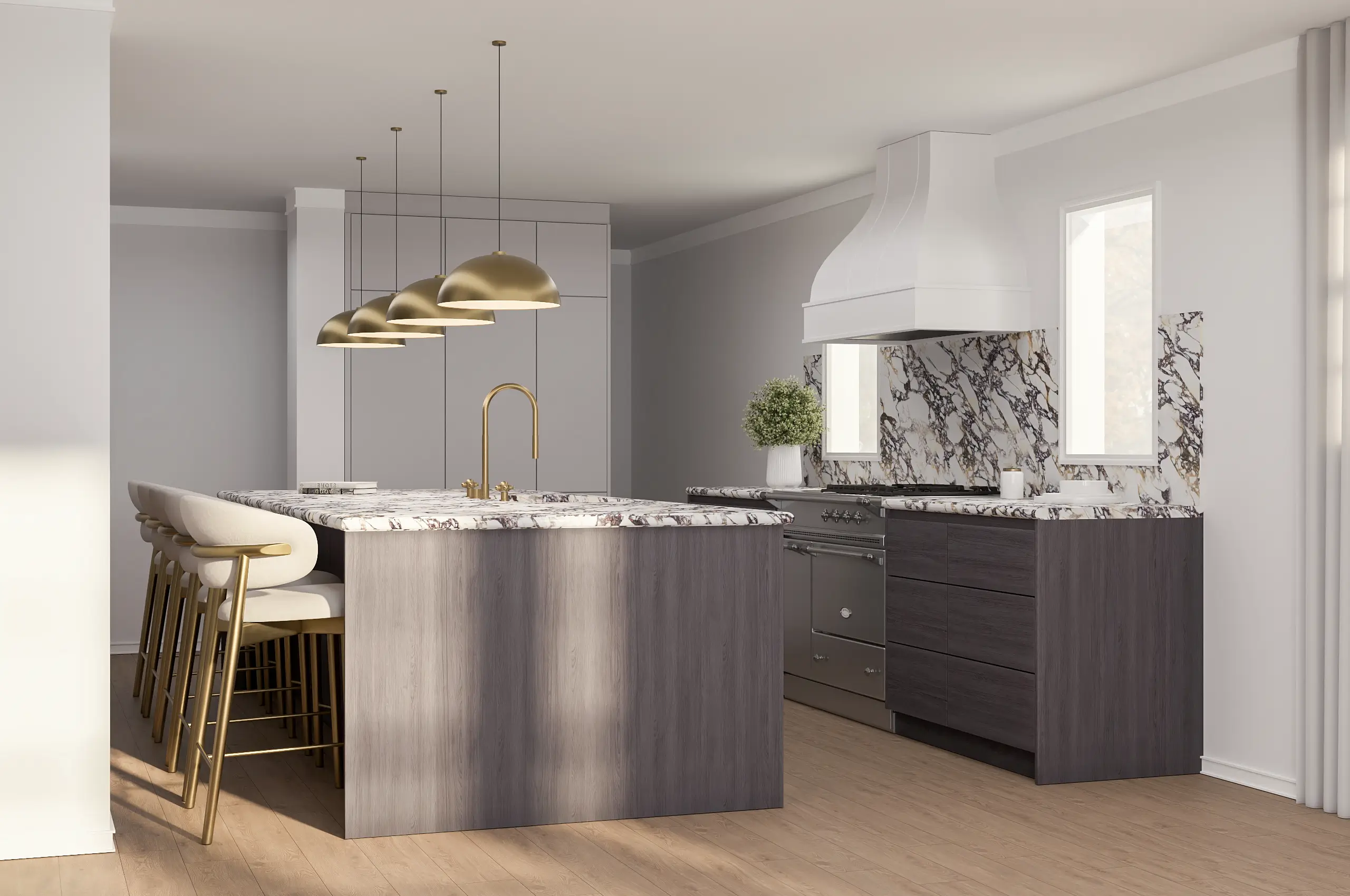 Design a light-filled, contemporary kitchen that harmonizes natural textures with elegant finishes and elevated functionality.